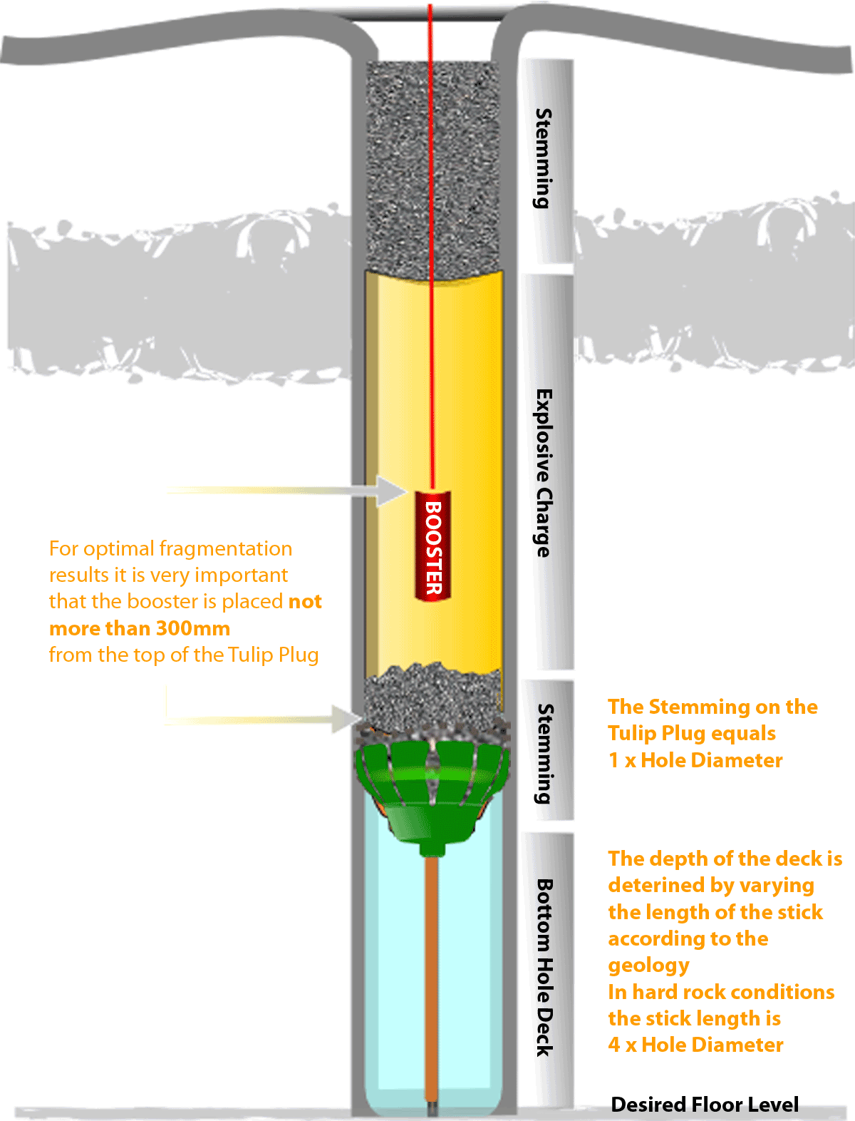 Introduction to Decking Hole decking is a system where the explosives in a blast pattern is layered in the blast holes to achieve a certain powder factor. The blasting TULIP that we sell is simply the easiest most effective way to achieve decking of explosives at the bottom of the blast hole. Using this alternative blasting method in conjunction with the blasting tulip has the effect that the blast dynamics change radically from the conventional way of blasting in the following way: 1) When using the 'tulip' to create a bottom deck, we often find that in order to improve fragmentation, the powder factor has to be decreased. This often clashes with the conventional midset where the idea has always been that in order to get better fragmentation one would need to increase the powder factor (add more explosives...) Instead of putting more energy into the blasthole, using the tulip system allows us to optimize energy usage more effectively where it's needed most - namely at the bottom of the hole. Hence the effect that more often than not - the powder factor can be reduced in stead of being increased. 2) Upon detonation of the blasthole the gap below the tulip plug now becomes the 'path of least resistance'. This alters the first movement in the blasthole to be downward rather than upward as in a conventionally charged blast hole. These basic but crucial differences make a world of difference to the outcome of the blast. It literally impacts the whole operation from the Mine to Mill. |